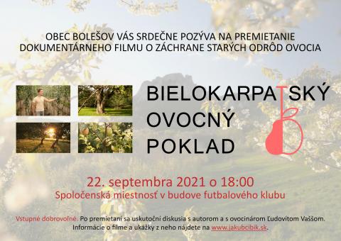 Obec Bolešov vás pozýva na premietanie dokumentárneho filmu Bielokarpatský ovocný poklad autora Jakuba Cíbika. Po premietaní bude diskusia s ovocinárom Ludovítom Vaššom, pestovateľom pôvodných ovocných odrôd a autorom filmu.